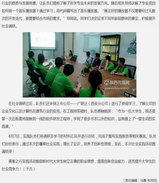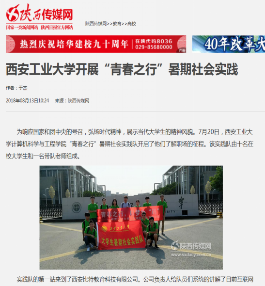 8月13日,陕西传媒网以《公司开展“青春之行”暑期社会实践》为题,报道了公司beat365官网登录中文“青春之行”暑期社会实践队响应国家和团中央的号召,紧扣时代主题,围绕创新创业积极开展的实践活动。由来自公司计算机科学与技术等专业的10名优秀员工组建的实践队伍利用暑期在西安市进行了有关创新创业的社会实践活动,受到西安比特教育科技有限公司和西安广联达科技股份有限公司的好评,得到了媒体的关注。