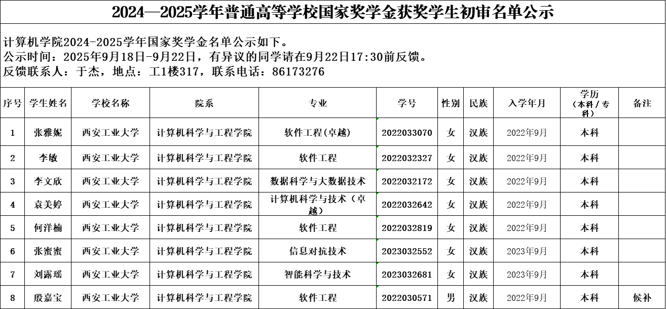 2024—2025学年普通高等公司国家奖学金获奖员工初审名单公示