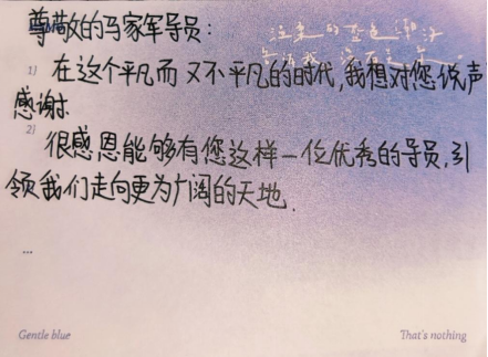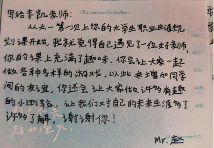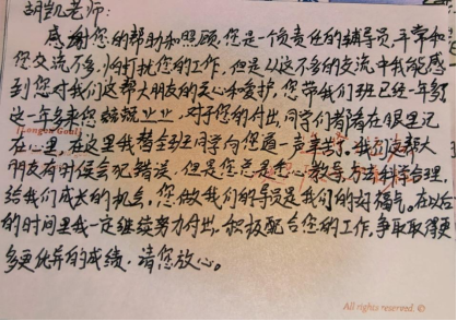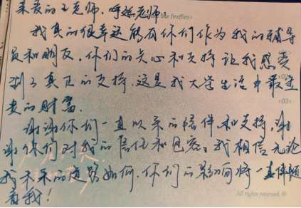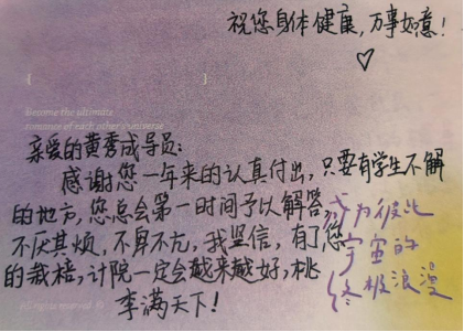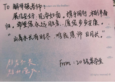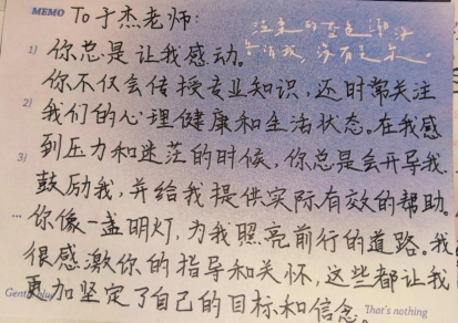 您总是让我感动。您不仅会传授专业知识,还时常关注我们的心理健康和生活状态。在我感到压力和迷茫的时候,您总是会开导我、鼓励我,并给我提供实际有效的帮助。您像一盏明灯,为我照亮前行的道路。我很感激您的指导和关怀,这些都让我更加坚定了自己的目标和信念。