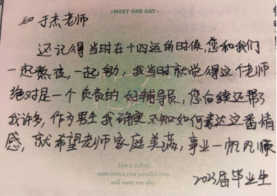 还记得当时在十四运的时候,您和我们一起熬夜,一起努力,我当时就觉得这个老师绝对是一个负责的好辅导员,您后续还帮了我许多,作为男生我确实不知如何表达这番情感,就希望老师家庭美满,事业一帆风顺。