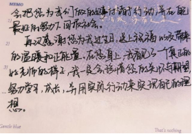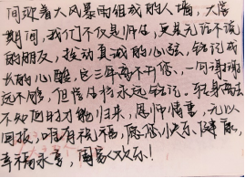 您像一束光一样温暖了我的大学时光,大二这一年您成为了我们的辅导员,无论我们什么时候给您发信息,您都在第一时间回复,在我们焦虑的时候安慰我们,记得去年疫情开学需要准备很多证明才可以返校,在我因为缺少其中一项证明的时候,我被拦在校门外,此时我真的很害怕,因为这是我的问题,但我在怀着忐忑的心去寻找您的帮助的时候,您并未责怪我,而是立马向上级请示,为我开证明并一直安抚我的情绪,最后我成功返校,我真的很感谢您!