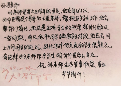 孙君老师是我大四学年的导员,他在我的认知中更像是个哥哥而不是老师,繁琐的员工工作他会帮我们简化,他总是站在员工的视角帮我们解决一些问题,每次他和同学碰面的时候他总会问上几句同学的近况,因此他对他负责的员工很熟悉,有这样的老师,作为员工的我们是多么幸运,祝孙老师生活事事顺意,事业节节高升!