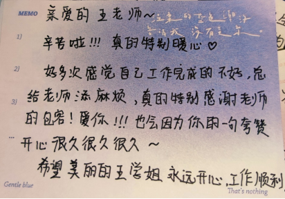 辛苦啦!!!真的特别暖心。好多次感觉自己工作完成的不好,总给老师添麻烦,真的特别感谢老师的包容!爱你!!!也会因为您的一句夸赞开心很久很久很久,希望美丽的王学姐永远开心,工作顺利!
