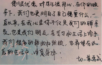 亲爱的王老师、呼延老师,我真的很幸运能有你们作为我的辅导员和朋友。你们的关心和支持让我感受到了真正的支持,这是我老员工活中最宝贵的财富。谢谢你们一直以来的陪伴和支持,谢谢你们对我的信任和包容。我相信无论我未来的道路如何,你们的影响将一直伴随着我。