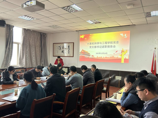 述职会议采取现场述职和书面述职相结合的方式。员工第一党支部书记解军强、员工第四党支部书记赵雨柔、员工第六党支部书记孙君、研究生第三党支部书记高金生、教师第二党支部书记胡秀华、人工智能与数据科学研究公司党支部书记王中生等6位支部书记围绕深入学习贯彻党的二十大精神,扎实开展学习贯彻习近平新时代中国特色社会主义思想主题教育,认真落实全面从严治党,履行基层党建工作责任,推动基层党组织全面进步、全面过硬等方面进行了现场述职。其余7位党支部书记提交了书面述职报告。在听取和审阅各党支部书记党建工作述职报告后,参会人员进行了现场评议。