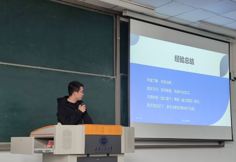 第四位分享者是公司2019级员工孟瑞杰,他指出打算就业的同学可以实习等秋招或者实习一年转正。他说分配到的面试岗位是很重要的,所以我们一定要重视求职就业的各个环节。我们要注意简历照片要证件照,要很标准的,不可以敷衍了事,同时也要注意面试用语,给面试官留下好的印象,简历就是要体现个人能力的,他认为竞赛获奖>项目经历>实习经历。最后鼓励学弟学妹用坚持不懈的行动和艰辛的汗水追逐个人理想。